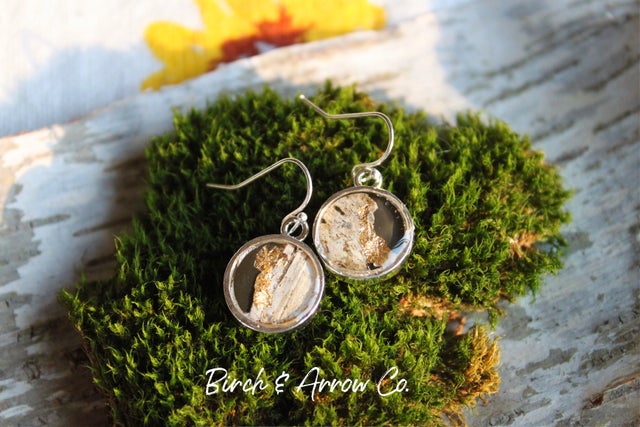 Mini Dangle earrings with charcoal resin overlaid with Birch Bark and 24k gold leaf.